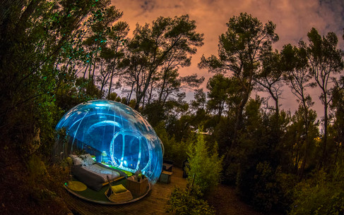 It offers comfortable sleep under the stars, traditional French breakfast in the picnic basket, pool and jacuzzi and one massage in front of your bubble.