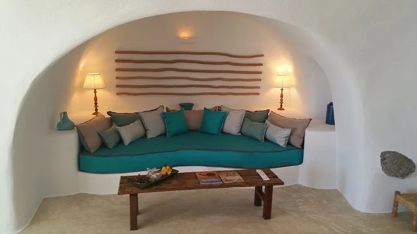 Rooms are named after Greek alphabet letters. They are curved out of the wall of the caldera, have polished cement and volcanic rock floors, very tactile décor, details like all-natural handcrafted beds and sheets and verandahs for the marvelous views.